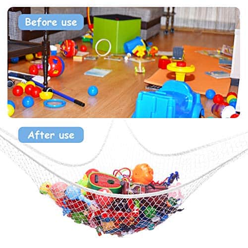 1. Organizador de Peluches Gigante: Esta hamaca de 84 x 59 x 59 pulgadas puede organizar peluches y otros juguetes de niños, como peluches, juguetes de mascotas, muñecas, pelotas, mantas, almohadas, equipo deportivo ligero, etc. La red de juguetes puede reemplazar el sillón de frijoles, caja de almacenamiento, cesto y baúl para ahorrar espacio en su habitación. 2. Materiales de Alta Calidad: Nuestra red para peluches está hecha de malla de poliéster tejida resistente y premium con un borde elástico duradero, lo que hace que esta red de esquina sea muy resistente y elástica. 3. Se incluyen ganchos y anclajes: Fácil de instalar este organizador de peluches, desinstalar y reinstalar. Incluye 3 ganchos con anclajes. 4. Red de pared perfecta para peluches: Ya sea que esté buscando un organizador de habitación de bebé o guardería, almacenamiento de juguetes para la habitación de ese niño o niña, esta hamaca de peluche se mezcla perfectamente. Simple y clásico, es justo lo que necesita para crear una decoración encantadora con un toque funcional. 5. Ordenado y Limpiamente – Organice esos peluches y otros juguetes de niños con esta gran red para peluches, elimine el desorden en el dormitorio, la sala de juegos y la bañera mientras organiza los juguetes de manera ordenada. Su habitación estará en buenas condiciones con la hamaca para juguetes de esquina.